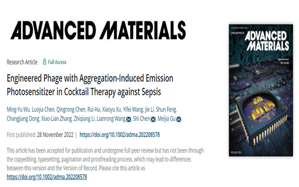 近日,国际材料科学领域顶尖期刊Advanced Materials(中科院一区,影响因子32.086)在线发表了365英国上市公司“生命分析技术与材料”科研团队的最新研究成果: “Engineered Phage with Aggregation-Induced Emission Photosensitizer in Cocktail Therapy against Sepsis”,有望为败血症的快速检测和治疗提供切实可行的临床方案。