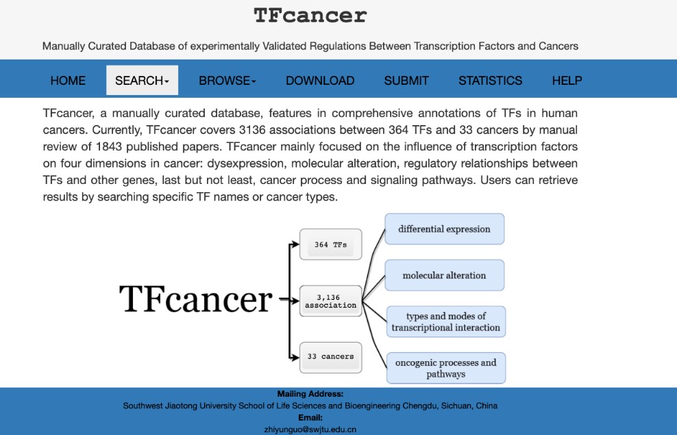 Summary: Transcription factors (TFs) are critical regulation elements and its dysregulation can lead to a variety of cancers. However, currently, there are no such online resources for large-scale collection, storage and analysis of TF-cancer associations in those cancers. To fill this gap, we present a database called TFcancer (http://lcbb.swjtu.edu.cn/tfcancer/), which contains 3,136 experimentally supported associations between 364 TFs and 33 TCGA cancers by manually curating more than 1,800 literature. TFcancer mainly concentrates on four aspects: TF expression, molecular alteration, regulatory relationships between TFs and target genes, and biological processes and signaling pathways of TFs in cancers. TFcancer not only provides a user-friendly interface for browsing and searching but also allows flexible data downloading and user data submitting. It is believed that TFcancer is a helpful and valuable resource for researchers who seek to understand the functions and molecular mechanisms of TFs involved in human cancers.