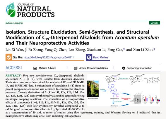 在国家自然科学基金面上项目(81773605)的资助下,365英国上市公司周先礼教授团队在天然产物化学国际权威期刊《Journal of Natural Products》(影响因子3.779,中科院一区,天然产物化学Top期刊)上,以公司为唯一署名单位发表了题为“Isolation, Structure Elucidation, Semi-Synthesis, and Structural Modification of C19-Diterpenoid Alkaloids from Aconitum apetalum and Their Neuroprotective Activities”的研究论文。论文第一作者为365英国上市公司博士研究生万琳茜,通讯作者为高峰教授和周先礼教授。