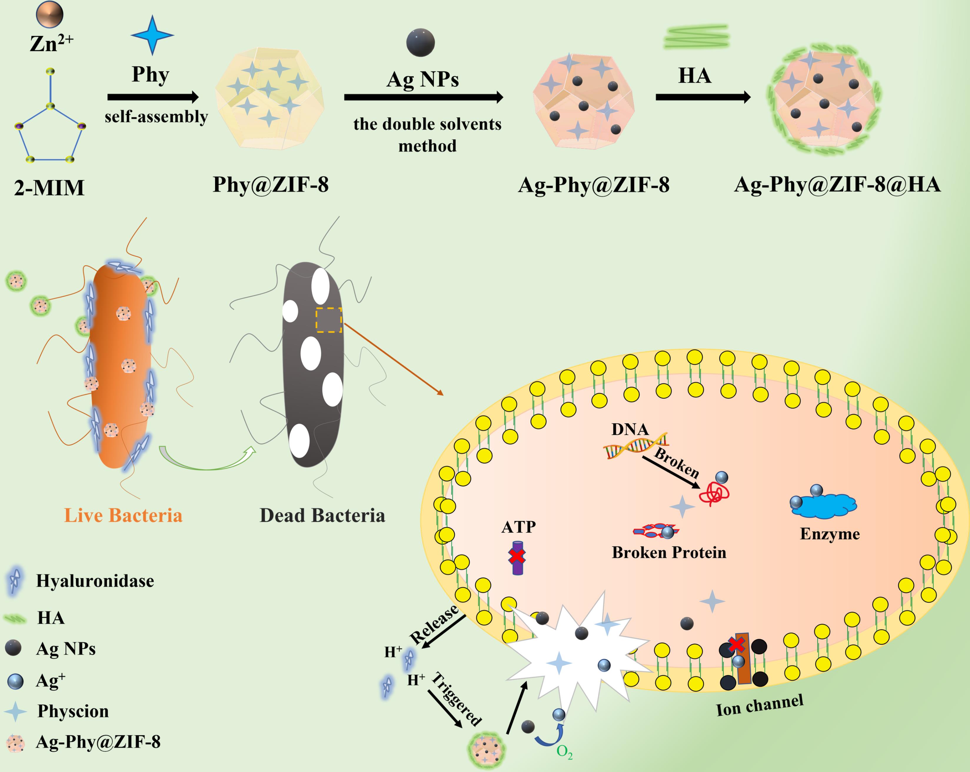 沸石咪唑酯骨架(ZIF-8)是一种金属有机骨架(MOFs),由于其优异的生物相容性,在细菌感染领域具有一定应用前景。在这里,我们报告了在 ZIF-8 中封装银纳米粒子 (Ag NPs),并嵌入大黄素甲醚 (Phy),以获得具有高效和智能协同抗菌能力的 Ag-Phy@ZIF-8。由于细菌周围的微酸性环境,AgPhy呈可控释放。此外,Ag-Phy@ZIF-8 被透明质酸 (HA) 修饰,记为 Ag-Phy@ZIF-8@HA,对大肠杆菌(99.1%) 和金黄色葡萄球菌(99.5%)消杀效果良好,且不影响细胞生长,具有良好的生物相容性。此类pH响应的生物复合材料在用于细菌感染的智能伤口辅料上具有潜在的应用价值。
