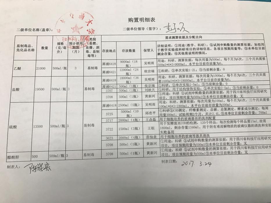 2017-04-06公司第二季度易制毒试剂购买送货通知 根据各位老师上个月提交的购置申请,目前已经依次完成资实处审核、保卫处审核、公司备案...